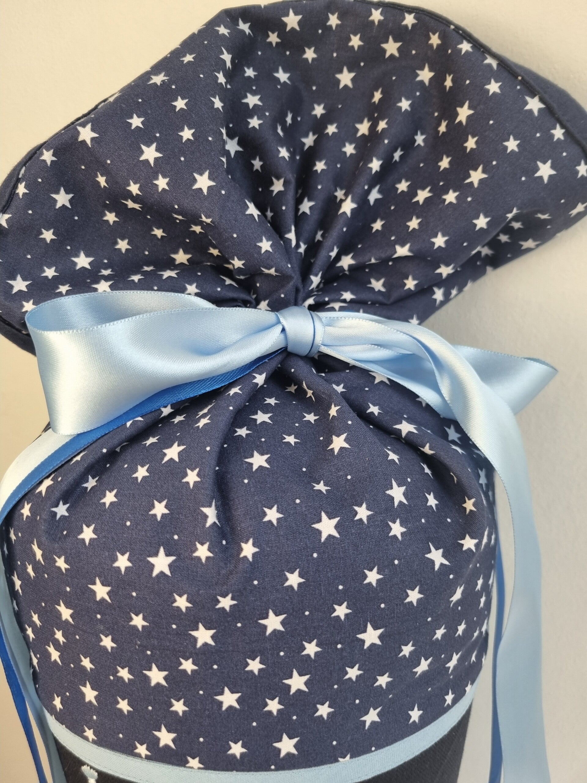 Jede Schultüte wird liebevoll aus hochwertiger Baumwolle genäht und kann mit dem Namen des Kindes bestickt werden.