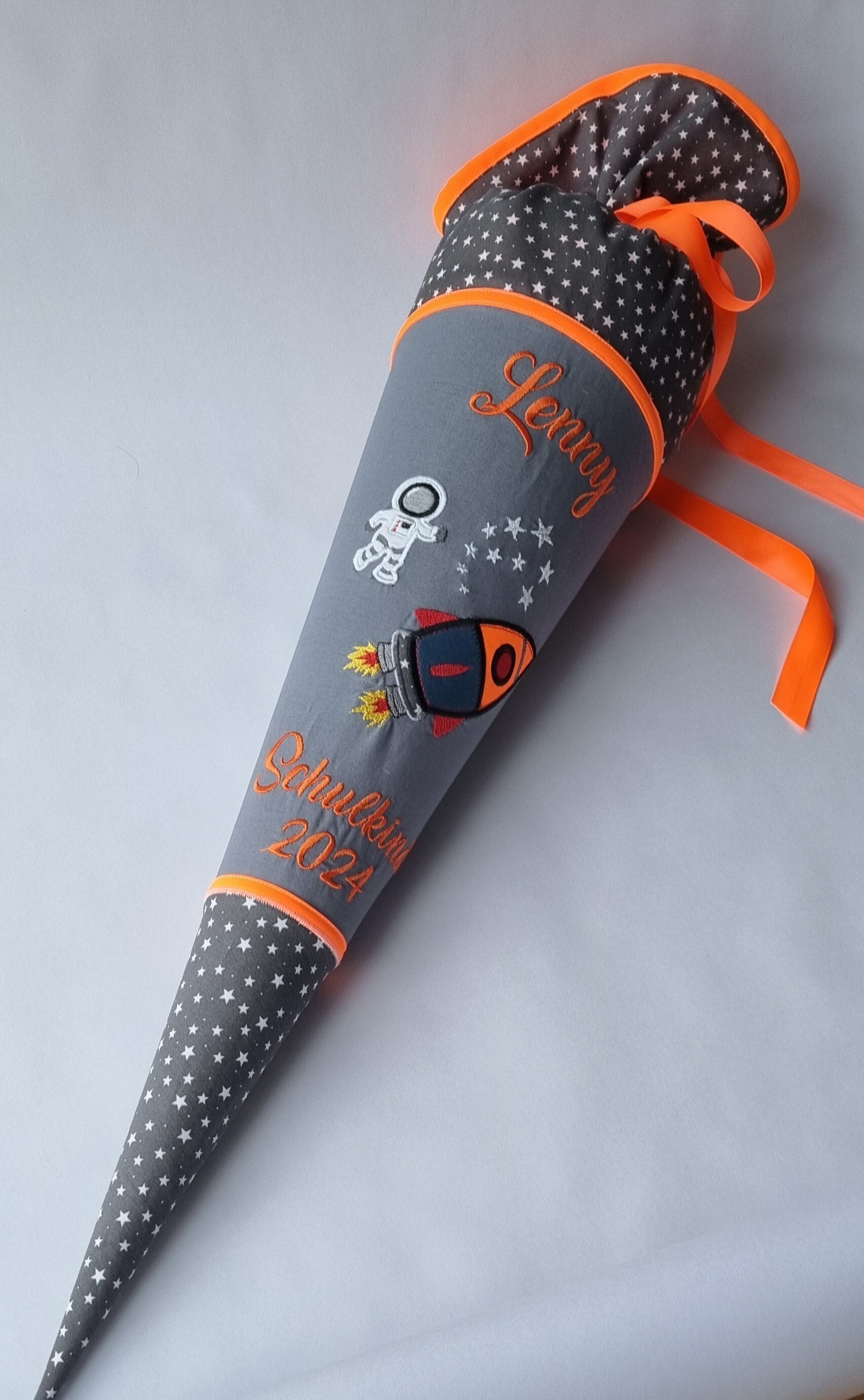 Jede Schultüte wird mit viel Liebe aus Baumwolle genäht und mit einer aufwendig bestickten Rakete, Astronaut und Sternen verziert.