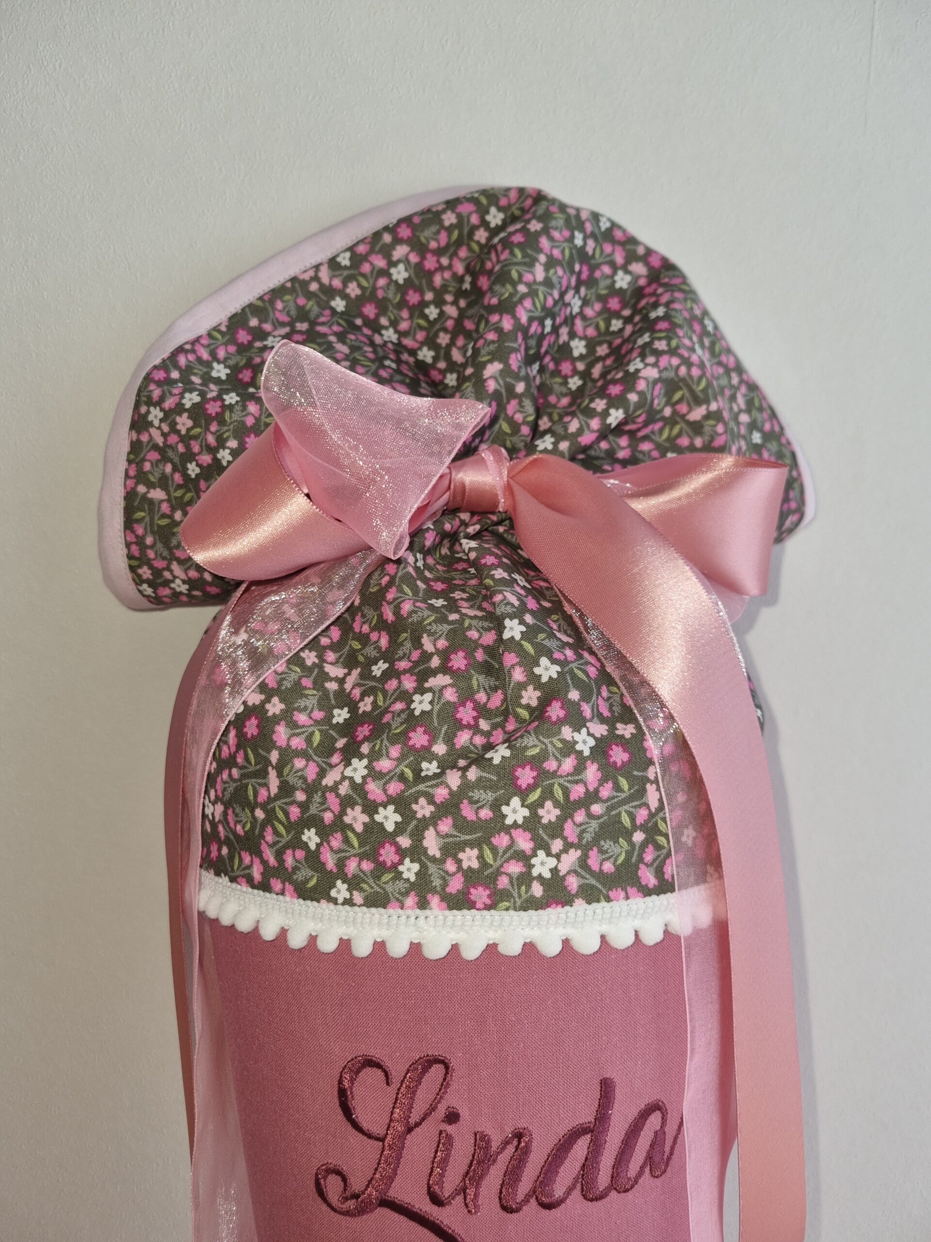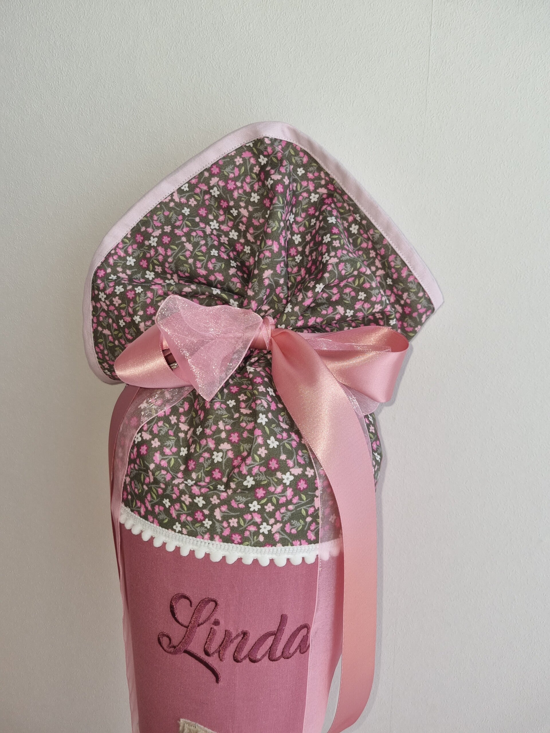 Personalisierte Schultüte Katze – Altrosa Blumenstoff, handgemacht aus Baumwolle