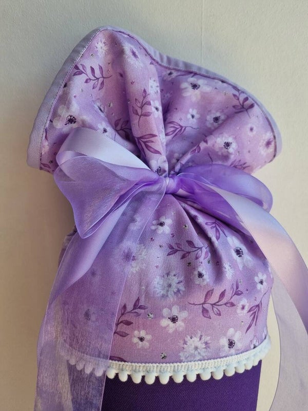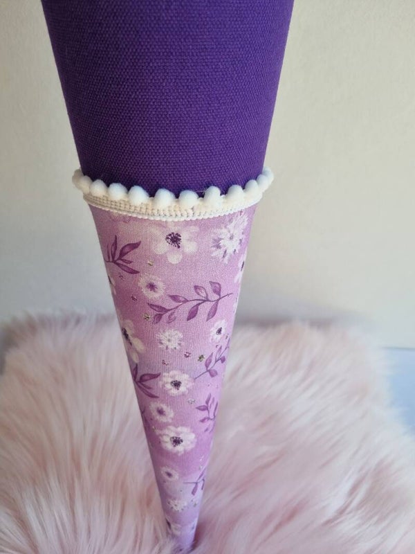 Diese liebevoll gestaltete Schultüte in Lila und Flieder ist ein echter Hingucker zum Schulanfang.