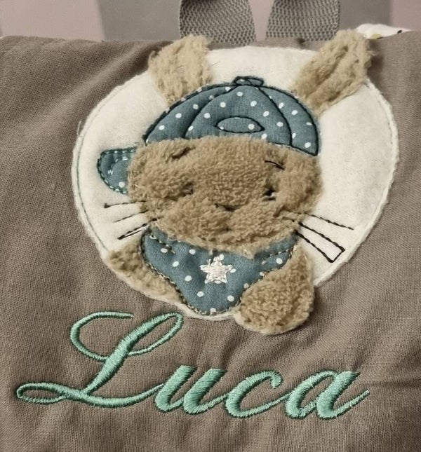 Der kuschelige Hase mit Mütze und Halstuch zaubert jedem Kind ein Lächeln ins Gesicht – und mit dem eigenen Namen wird der Rucksack zu einem ganz persönlichen Lieblingsstück. 🌈