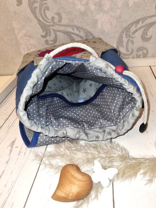 Personalisierter Kinderrucksack Feuerwehr – handgemacht in Grau & Blau mit Namen