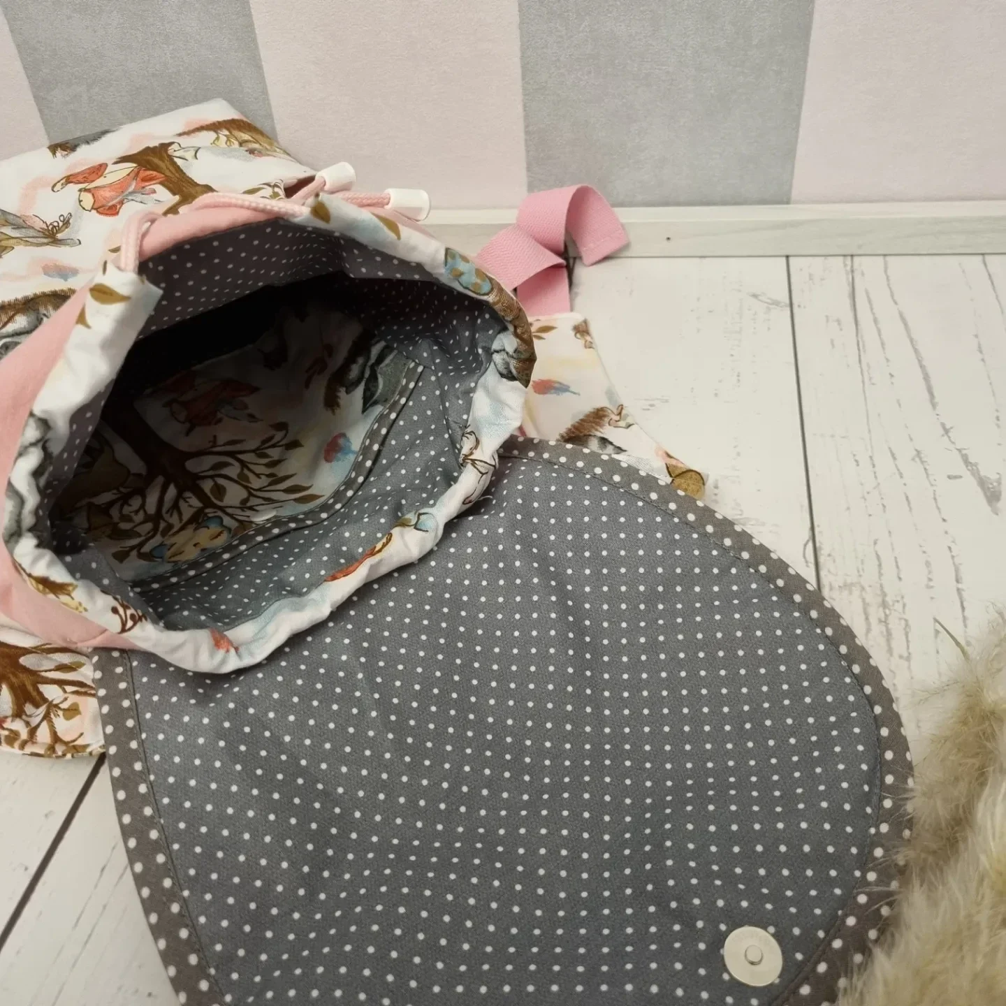 Das zarte Rosa kombiniert mit dem verspielten Waldtier-Stoff macht diesen Rucksack zum perfekten Begleiter für Kindergarten, Krippe oder kleine Abenteuer in der Natur.