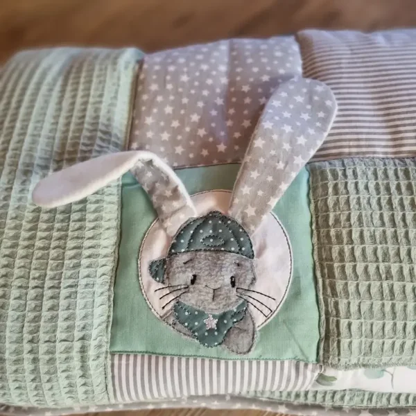 Das Highlight ist der aufgenähte Hase mit 3D-Ohren, der für kleine Kinderhände zum Greifen und Staunen einlädt.