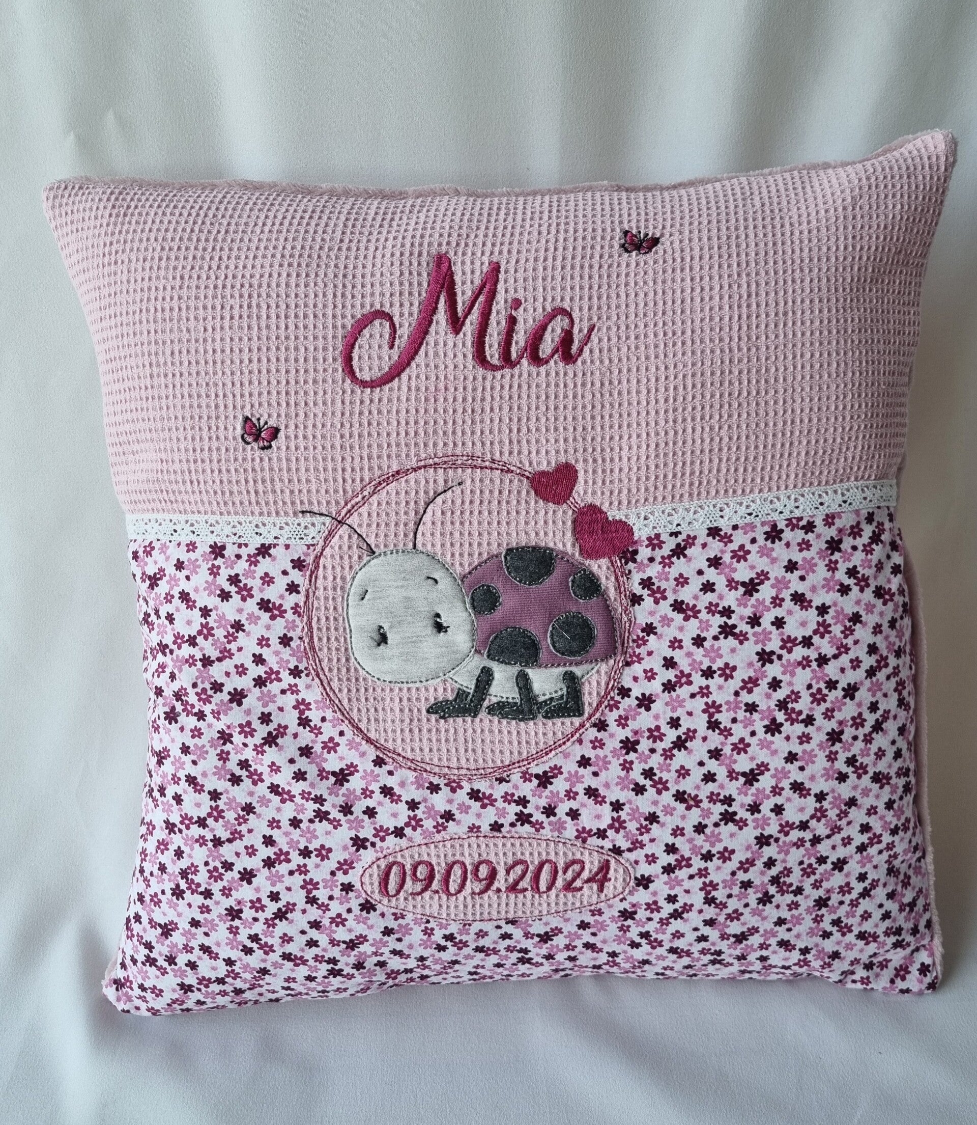 Personalisierbares Kinderkissen mit Marienkäfer – Rosa & Blumen – Handgemacht von Mariposa Design