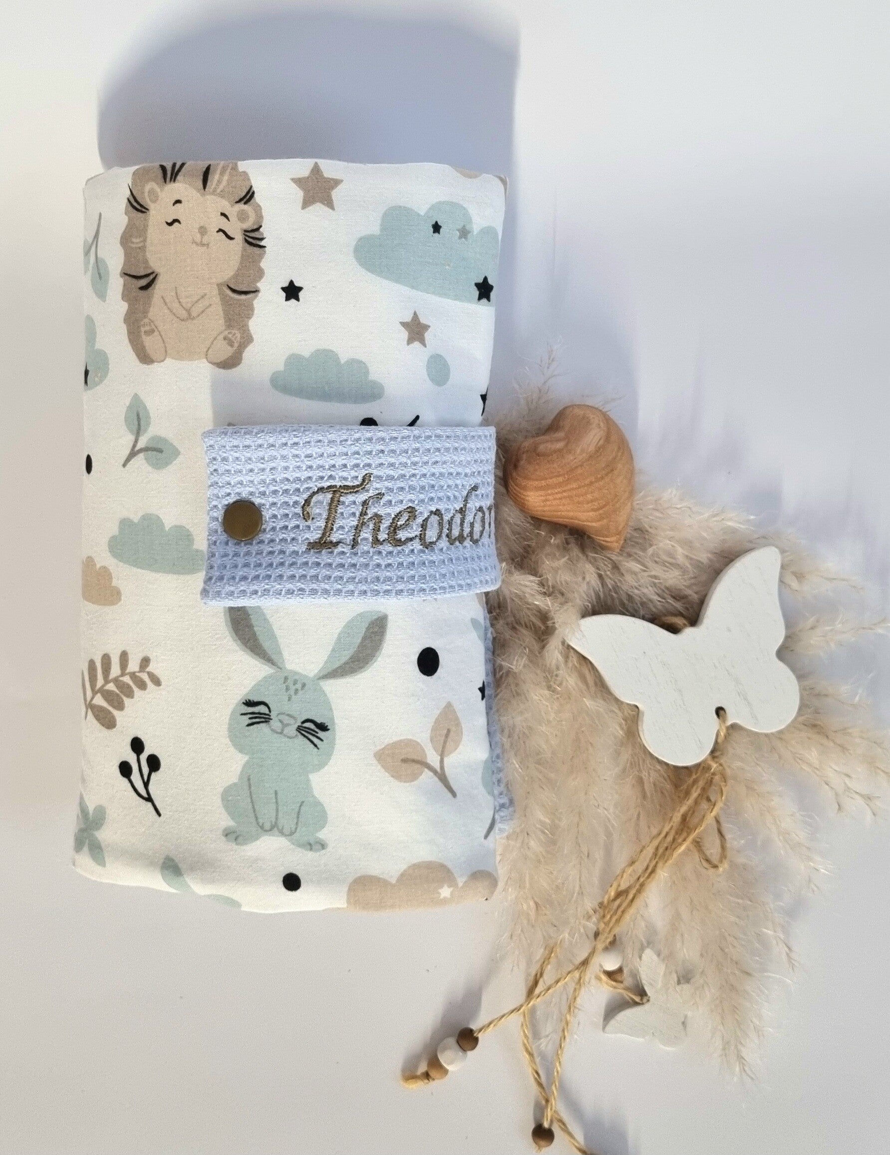 Mit ihrem süßen Igel- und Hasenmotiv auf zartem Baumwollstoff und der hellblauen Waffelpiqué-Struktur vereint sie Natürlichkeit und Charme – ein echter Hingucker in jeder Wickeltasche!