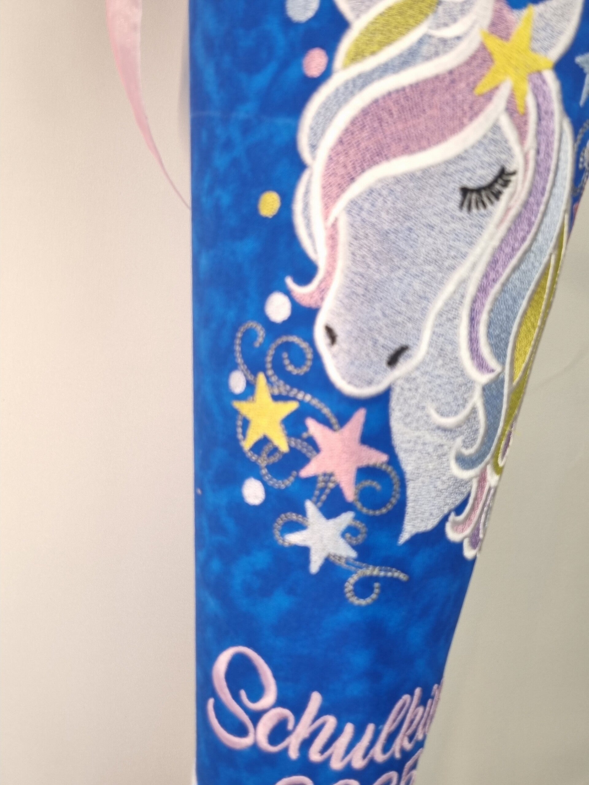 Diese handgefertigte Schultüte mit Einhorn-Stickerei sorgt für magische Momente am ersten Schultag!