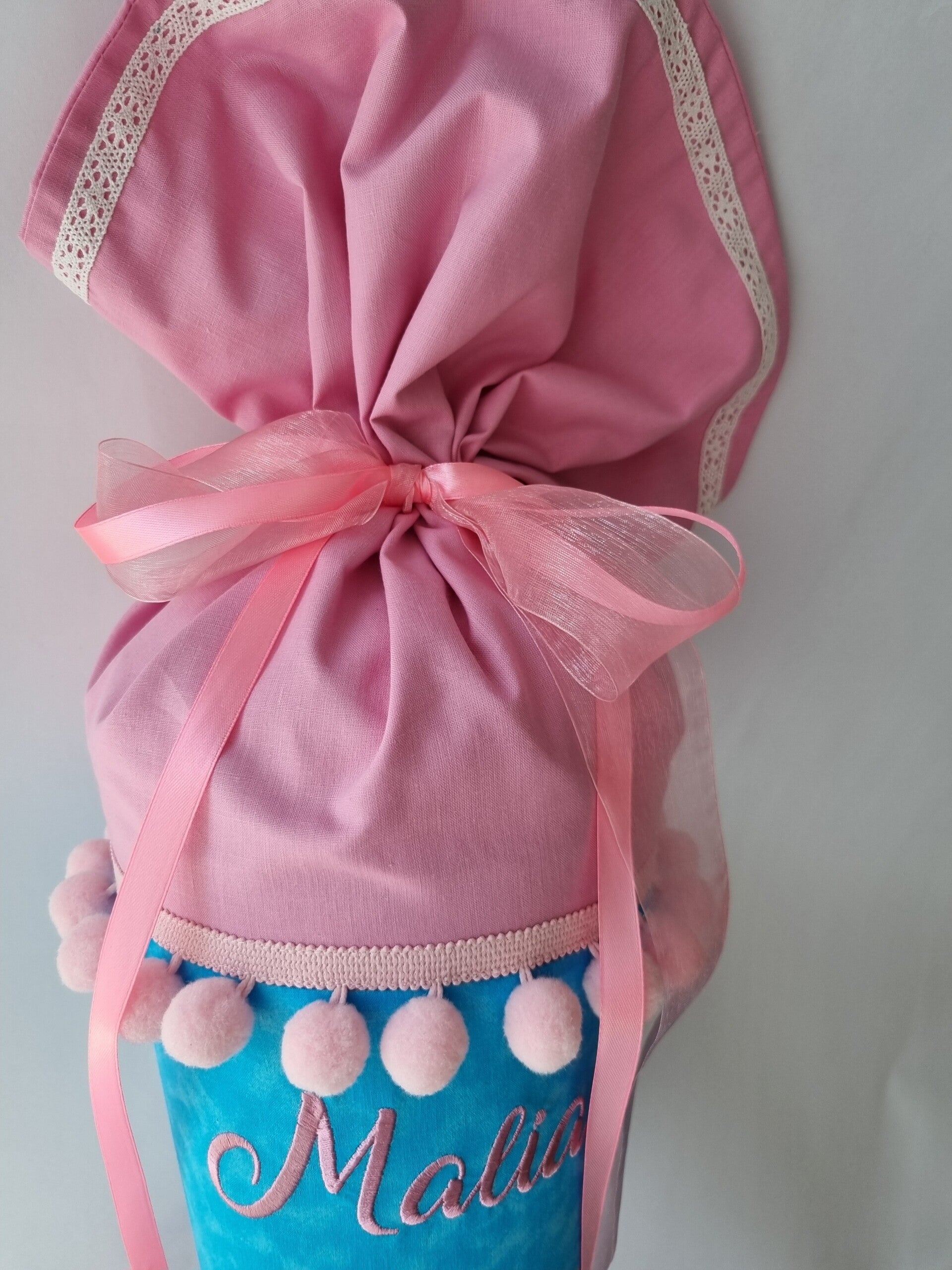 Mit feiner Stickerei, Pompon-Borte und personalisiertem Namen wird sie zum besonderen Begleiter am ersten Schultag.